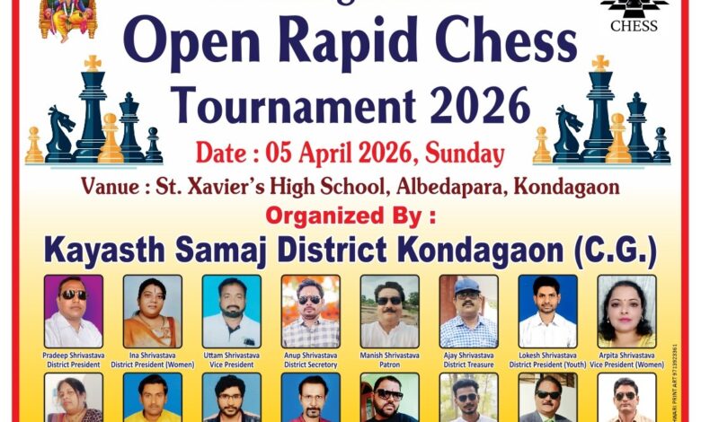 जिले में पहली बार कायस्थ समाज कोण्डागांव द्वारा राज्य स्तरीय शतरंज प्रतियोगिता का आयोजन सेंट जेवियर्स स्कूल में किया गया। प्रतियोगिता में राज्यभर से आए 65 से अधिक खिलाड़ियों के बीच शह और मात के रोमांचक मुकाबले देखने को मिले।