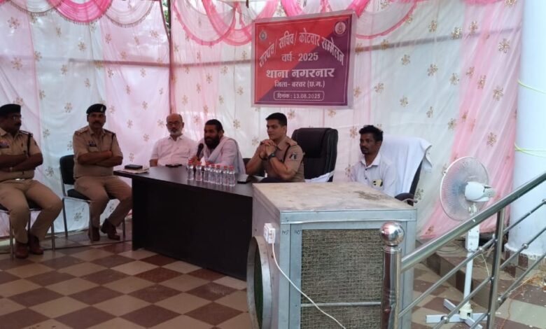 दिनांक 13.08.2025 को थाना नगरनार के थाना परिसर में पुलिस अधीक्षक महोदय श्री शलभ कुमार सिन्हा के दिशा निर्देशन में अतिरिक्त पुलिस अधीक्षक महोदय श्री माहेश्वर नाग, नगर पुलिस अधीक्षक महोदय श्री सुमीत कुमार डी धोत्रे (भा०पु०से०) की उपस्थिती में सामुदायिक पुलिसिंग के तहत ग्राम सरपंच/उपसरपंच/सचिव/कोटवार सम्मेलन का आयोजन किया गया। कार्यक्रम में थाना नगरनार क्षेत्र के ग्रामों के ग्राम सरपंच/उपसरपंच/सचिव/ कोटवार के अलावा गौसेवक, बजरंग दल के पदाधिकारी गण रवि ब्रम्हचारी, मुन्ना बजरंगी, भरत बघेल. जागेश्वर साहु नवीन देवांगन विष्णु ठाकुर, रोहित घोष, पवन राजा एवं अन्य नागरिक गण बड़ी संख्या में शामिल हुये। कार्यक्रम में अतिरिक्त पुलिस अधीक्षक महोदय श्री महेश्वर नाग, नगर पुलिस अधीक्षक महोदय श्री सुमीतकुमार डी धोत्रे (भा०पु० से०), ग्राम सरपंचो, बजरंग दल के पदाधिकारियो एवं गौसेवको के द्वारा गौ रक्षा, गायो/मावेशियो के रोड एक्सीडेंट से होने वाले आकस्मिक मृत्यु को रोकने हेतु लोगो में जन जागरूकता लाकर सार्थक प्रयास करते हुये गौवंश की रक्षा करने सुक्षाव / समझाईस देते हुये प्रत्येक ग्राम पंचायत से अलग अलग दिवस में राष्ट्रीय राजमार्ग पर रात्रि गस्त कर लावारिस घुम रहे गौवंश को सुरक्षा प्रदान कर सुरक्षा हेतु उचित व्यवस्था करने जोर दिया गया। कार्यक्रम में इसके अलावा सामुदायिक पुलिसिंग के तहत सामाजिक बुराई मद्यपान, नशाखोरी, से होने वाले सामाजिक /आर्थिक नुकसान, सायबर फ्रॉड से बचने के उपाय यातायात नियम में विशेष कर दुपाहियो वाहन चलाते समय हेलमट के उपयोगिता को समझाते हुये हेलमेट के महत्व के बारे में विस्तारपूर्वक जानकारी साझा की गई।